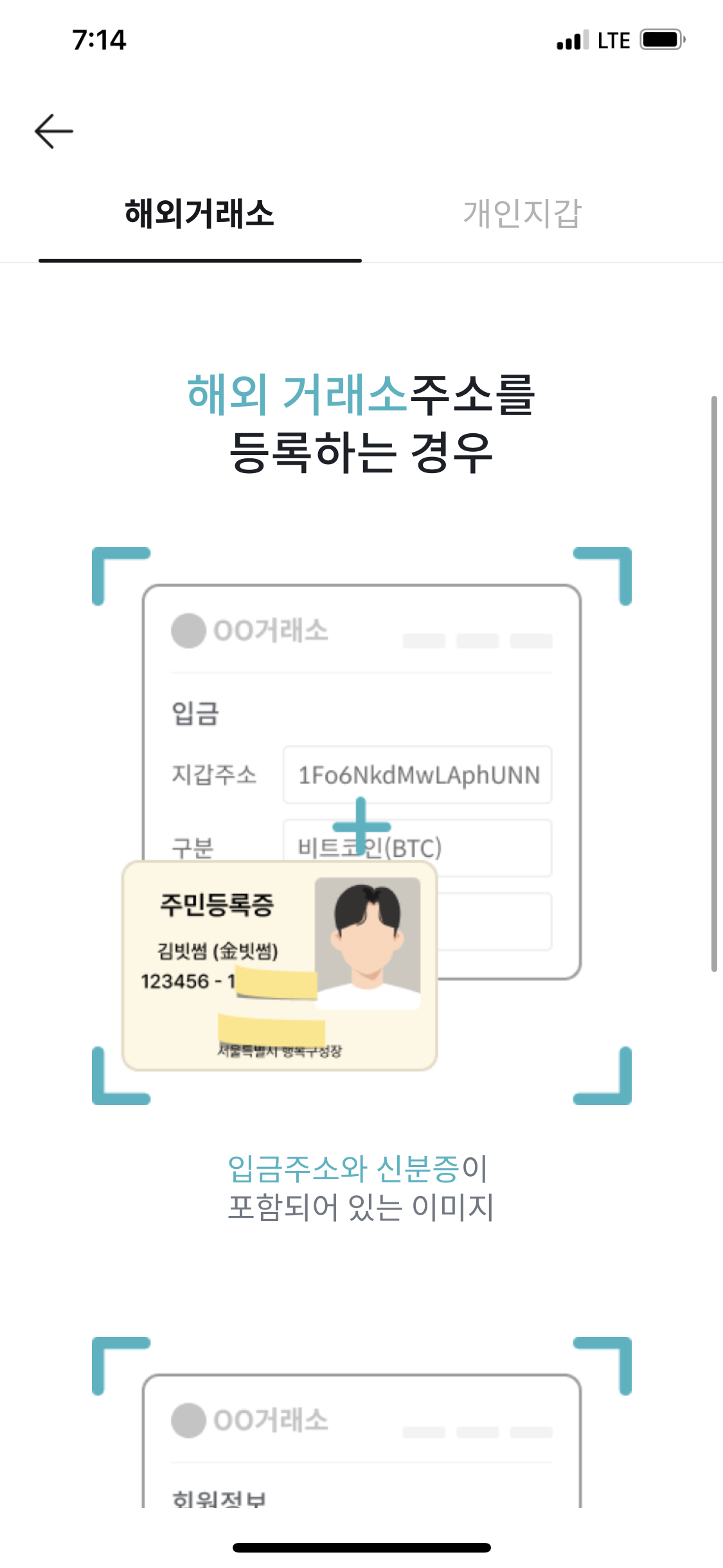 주소를 등록하기 위해서 입금할 주소의 거래소의 정보와 함께 사진을 찍어야 합니다. 신분증 기준으로는 주민등록번호 뒷자리와 발행년도를 마스킹하고 하고 사진을 찍으셔야 합니다.