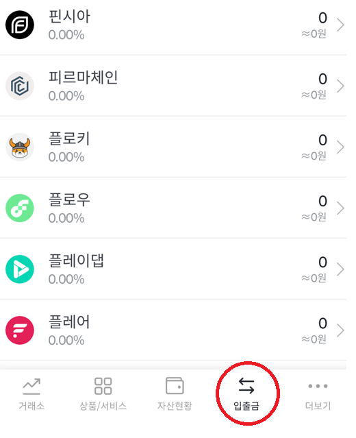 빗썸 앱을 이용하여 들어가면 하단에 입출금 버튼이 있습니다. 출금주소등록을 원하는 코인을 찾아서 들어간 후 오른쪽 사진과 같이 출금하기 버튼을 누르면 됩니다.