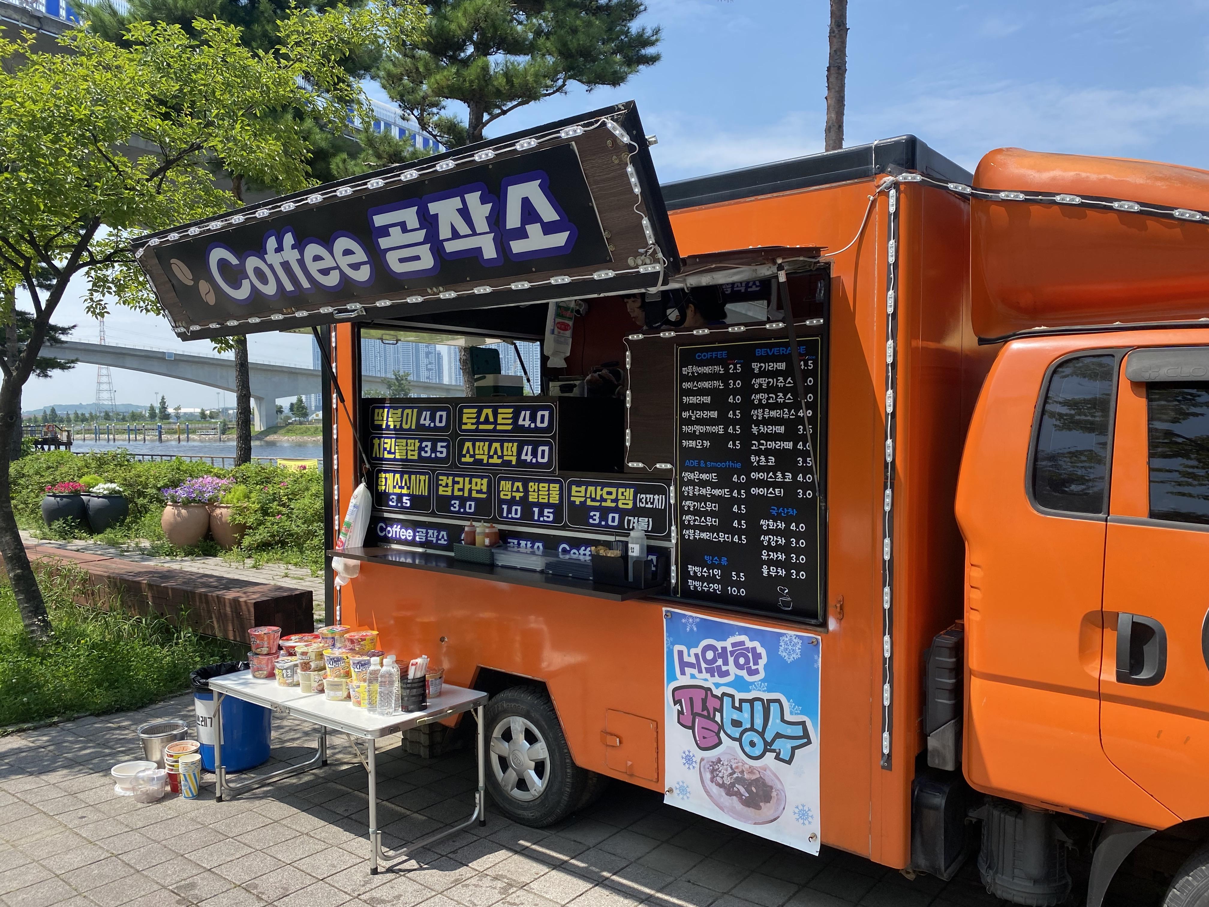 물놀이터 옆에 야구르트 아주머니가 계셨고 좀 더 가면 커피공작소가 있습니다. 저희는 배가 출출해서 커피 공작소에서 소세지와 치킨콜팝을 주문해서 먹었습니다. 그 밖에도 팥빙수, 토스트, 소떡소떡, 컵라면, 커피류를 판매하고 있습니다.