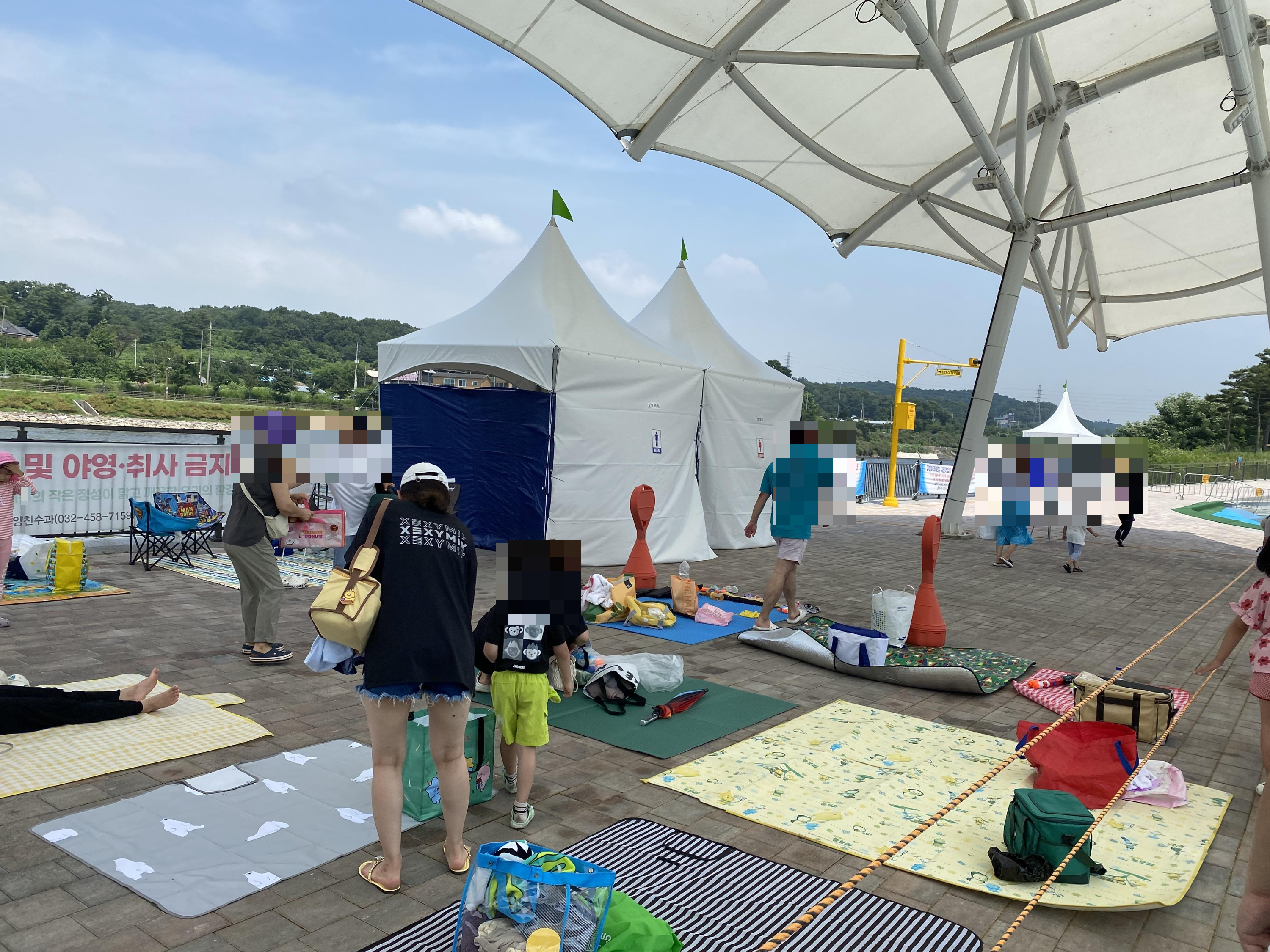 돗자리를 깔고 휴식을 취할수 있는 공간은 넉넉히 있어서 안심하고 가셔도 됩니다. 다만 선착순으로 물놀이터 안쪽을 이용할 수 있는데 자리가 없으면 조금 떨어진 곳에도 있습니다. 저희는 그냥 조금 떨어진 곳에 돗자리를 깔고 물놀이를 이용했습니다. 조금 빨리 오시면 안쪽에 좋은 자리를 이용할 수 있습니다.