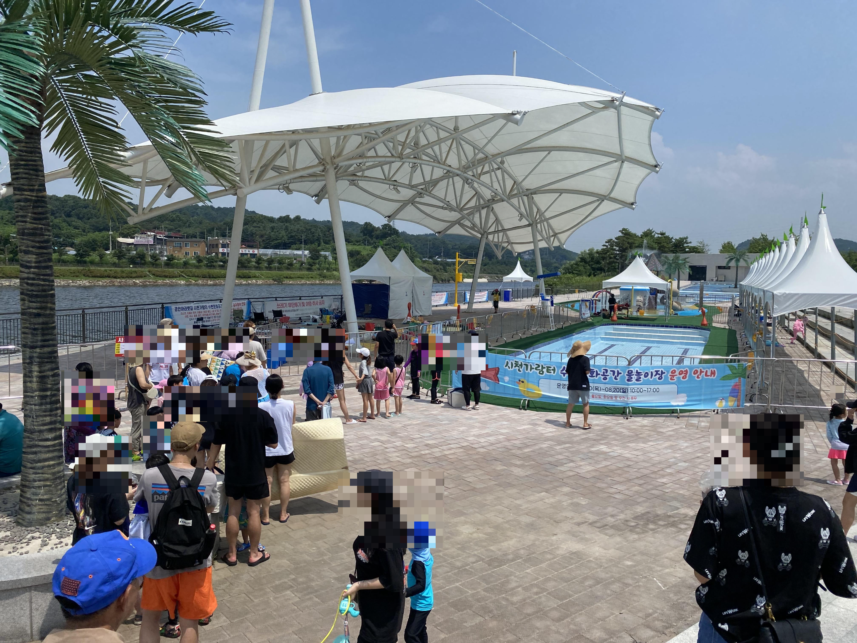 1시에 가니깐 먼저 들어가서 자리를 잡으려고 줄을 서고 있었습니다. 좋은 자리를 맡기 위해서는 줄을 서야 하셔야합니다. 그리고 물놀이장 중간에 탈의실이 있어서 이용하시면 됩니다.