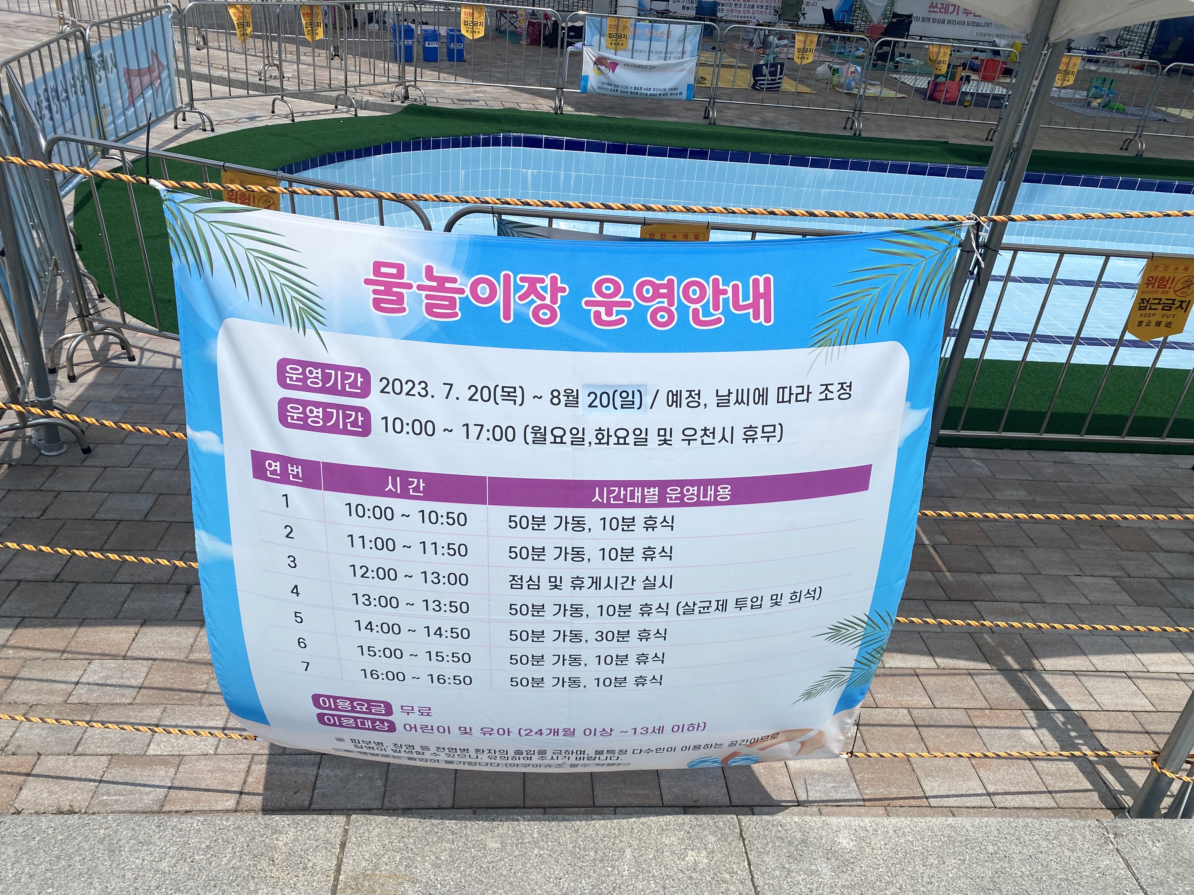 이용요금 무료이며, 시간대별 운영은 위 현수만처럼 운영이 됩니다. 저희는 이걸 모르고 12시에 도착했다가 점심시간에 걸려서 무더위에 고생을 했습니다. 13:00에 살균제 투입 및 희석을 하니 14:00 시간대부터 이용한 것도 좋은 거 같습니다.