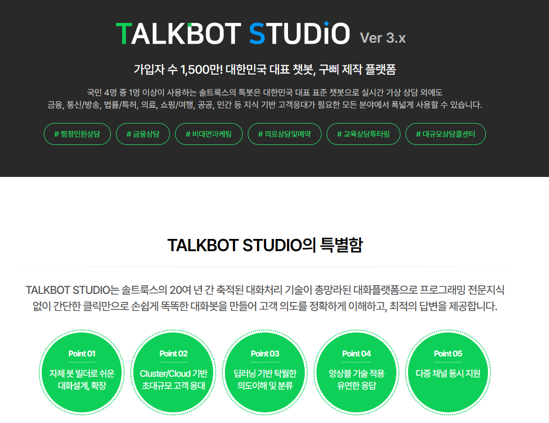 톡봇 스튜디오는 고품질 자연어 이해와 처리를 지원하며, 초대규모 고객응대를 위한 실시간 플랫폼입니다. QA 기술의 융합 앙상블 AI를 통해 대화모델, IRQA, MRC 문서 관리 등을 제공합니다.