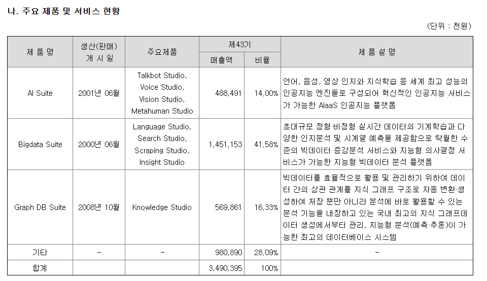 솔트룩스의 주요 제품의 판매는 빅데이터 Suite에서 41%의 비율로 발생하고 있습니다.