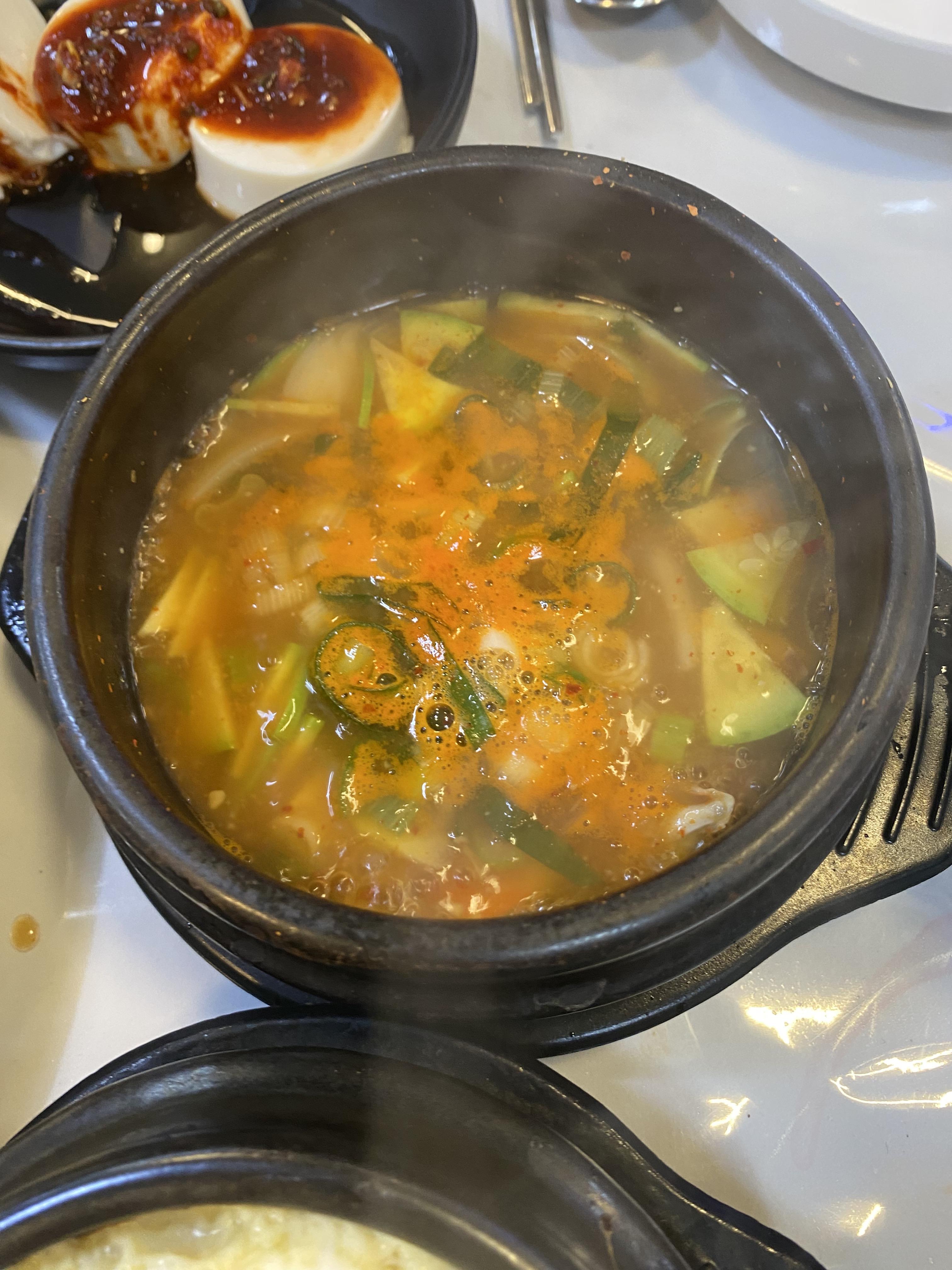 기본반찬은 콩나물, 김치, 버섯, 양파, 명이나물, 파무침, 계란찜, 된장찌개, 순두부가 제공이 됩니다. 특히 명이나물과 된장찌개는 너무 맛있습니다. 참고로 명이나물은 추가비용이 3,000원이었지만 너무 맛있어서 한 번 더 주문했습니다.