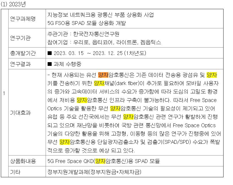우리로의 사업보고서 연구내용을 검색하시면 연구를 진행하고 있습니다. 내용은 지능정보 네트쿼크용 광통신 부품 상용화 사업 5G FSO용 SPAD 모듈상용화 개발을 하고 있습니다. 개발기관, 기대효과는 위 내용을 참고하시면 됩니다.