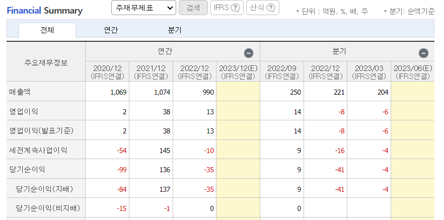 매출액은 감소하고 있으며 영업이익은 64.8% 감소하면서 적자로 전환했습니다. 주요 원인으로는 환율상승에 따른 상품원가 상승, 개발비를 비롯한 판관비 상승에 따른 비용증가, 종속기업 지분 매각에 따른 손실 반영 및 금융투자자산 평가손실 반영이 있습니다.
