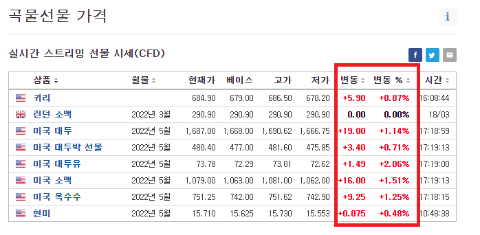인베스팅 닷컴 곡물 선물 가격을 실시간 자료를 보게 되면 상승을 하고 있는