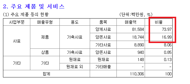 주요 매출 비율은 가축사료 중 양계사료가 약74%, 양돈사료가 약 17%의 구성으로
