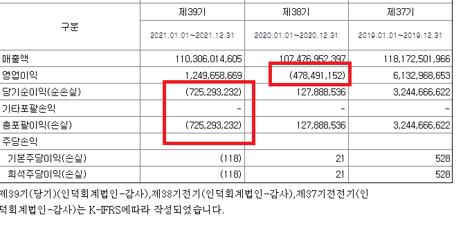 2021년 사업보고서를 보시면 당기순이익이 손실로 잡혔으며, 2020년에는 영업이익이
