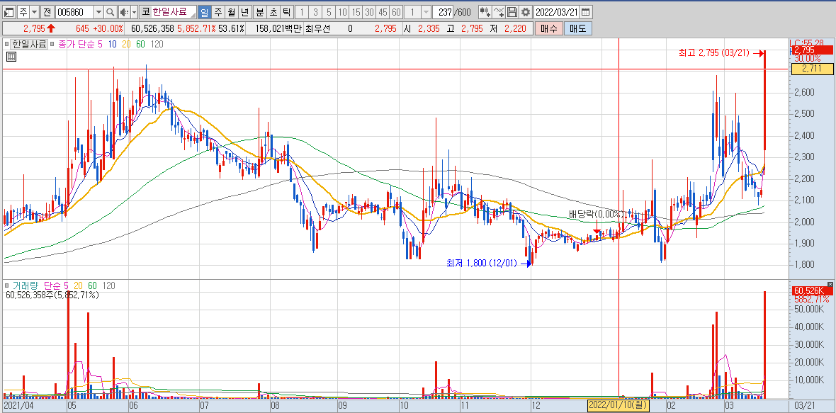 돌파하는 모습을 보여주었습니다. 한일사료의 차트를 봤을 때는 앞으로 사료 주 테마의 힘이 남아 있는 것으로