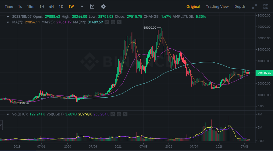 비트코인의 가격 변동: 비트코인 가격은 지난해의 침체 상황(Crypto Winter) 이후 올해 들어 회복을 보이고 있습니다. 2021년 11월 9일에는 $67,734까지 상승하였으나, 이후 테라 사태와 FTX 파산 등으로 2022년 11월 21일까지 $15,631로 하락하였습니다. 그러나 2023년 들어 회복세를 보이며, 7월 3일에는 연간 최고치인 $31,128.76까지 상승하여 현재는 약 $30,000에서 등락하고 있습니다.