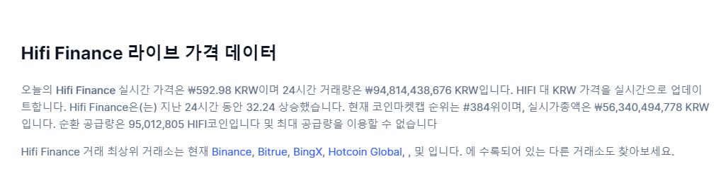 하이파이(HIFI) 코인은 코인마켓캡 순위로는 384위이며, 시가총액은 560억 정도 규모에 해달 하는 암호화폐입니다.