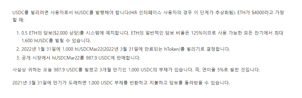 하이파이 백서에 나온 대출을 하는 방법에 대해서 나온 문서입니다. 이더리움의 담보비율이 125%이며, 최대 1,600 hUSDC를 빌릴 수 있습니다. 이것저것 계산을 하면 연이율 5%에 이더리움을 담보로 대출을 할 수 있다는 것입니다.