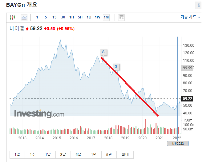 바이엘은 몬산토를 인수한 이후 약 100달러의 주가가 40달러까지