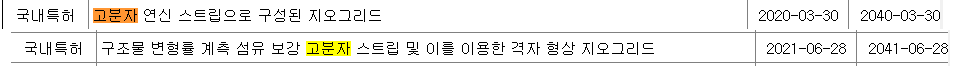 공시내용에는 고분자 연신 스트립으로 구성된 지오그리드, 구조물 변형률 계측 섬유 보강 고분자 스트립 및 이를 이용한 격자형상 지오그리드 특허만 보유하고 있습니다.