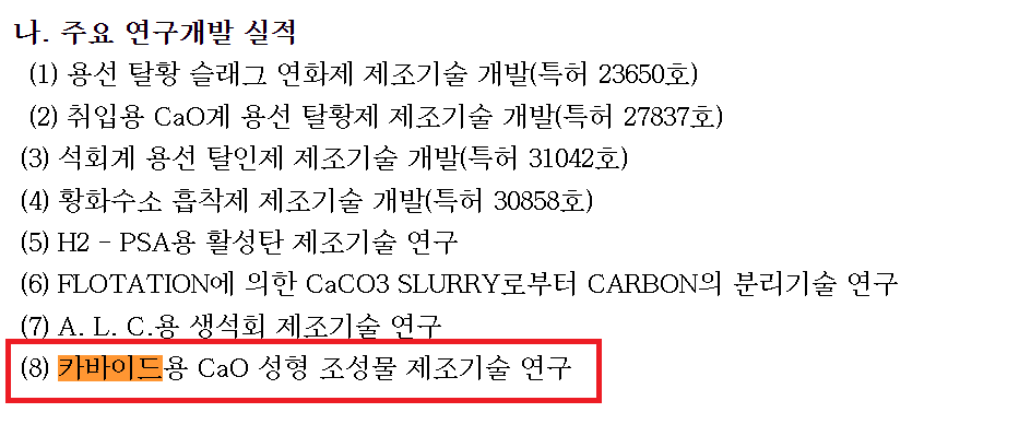 태경산업 주요 연구개발 실적으로는 카바이드용 CaO 성형 조성물 제조기술 연구가 있습니다.