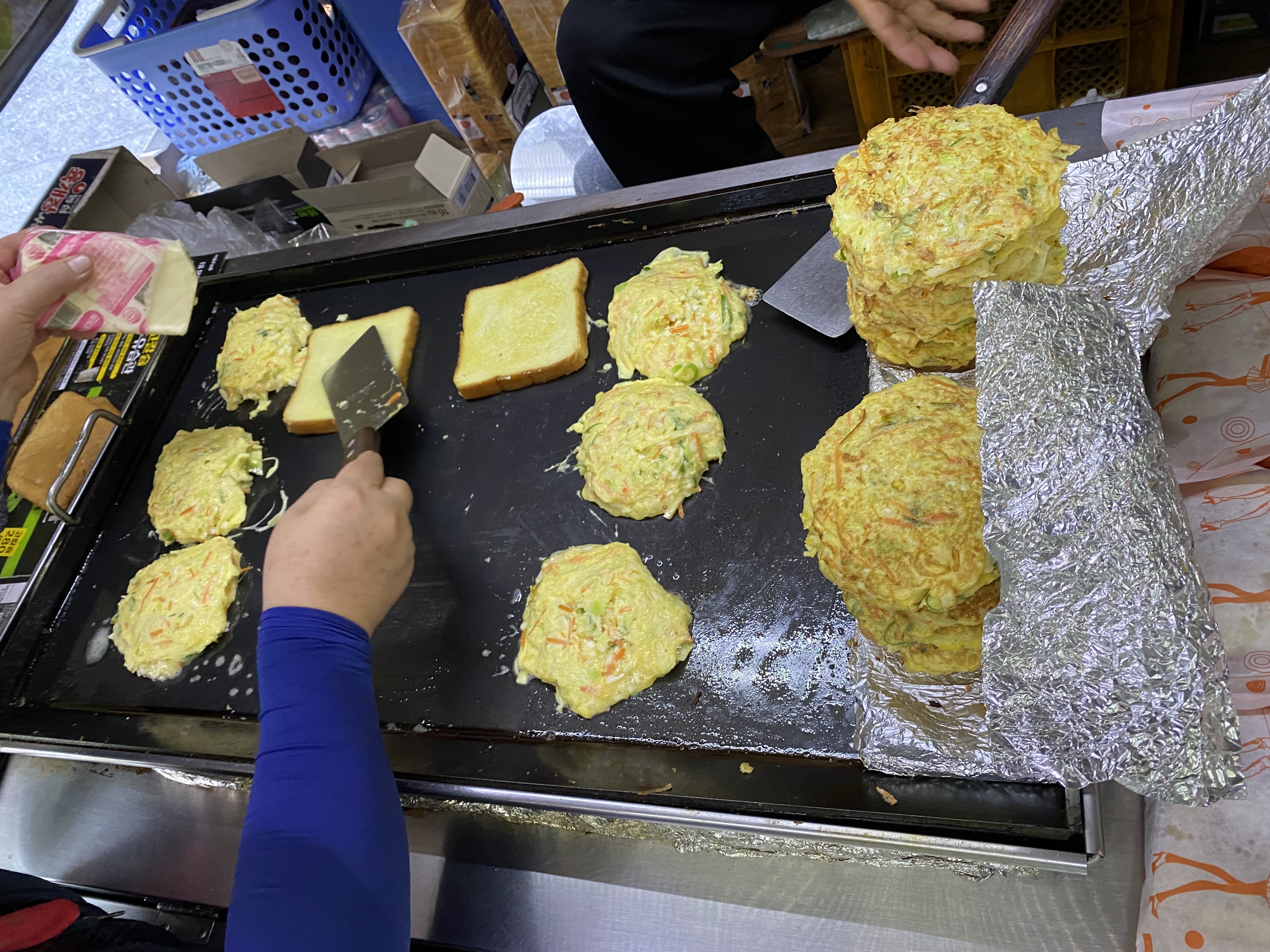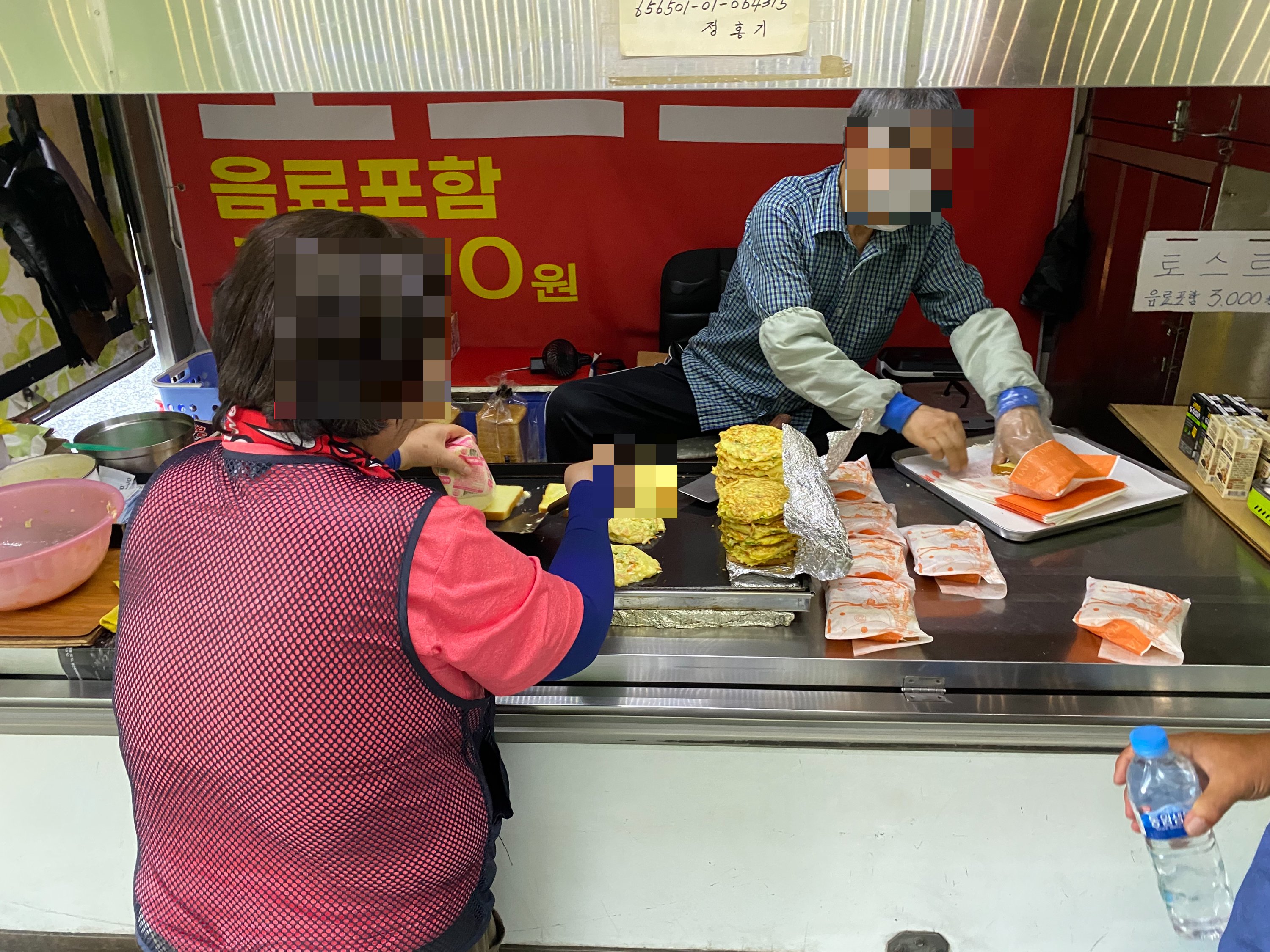 할아버지께서 직접 계란이랑 빵을 구워서 토스트를 만들어 주시고 할머니께서 계산을 하고 제공해주십니다. 정말 정이 많으셔서 단골에게는 가끔씩 계란을 2개나 넣어주실 때도 있습니다. 이곳 토스트가 맛있는 이유는 정도 정이지만 계란에 야채가 정말 듬뿍 들어가 있습니다. '이렇게 제공해도 남는게 있나?' 싶을 정도였습니다.