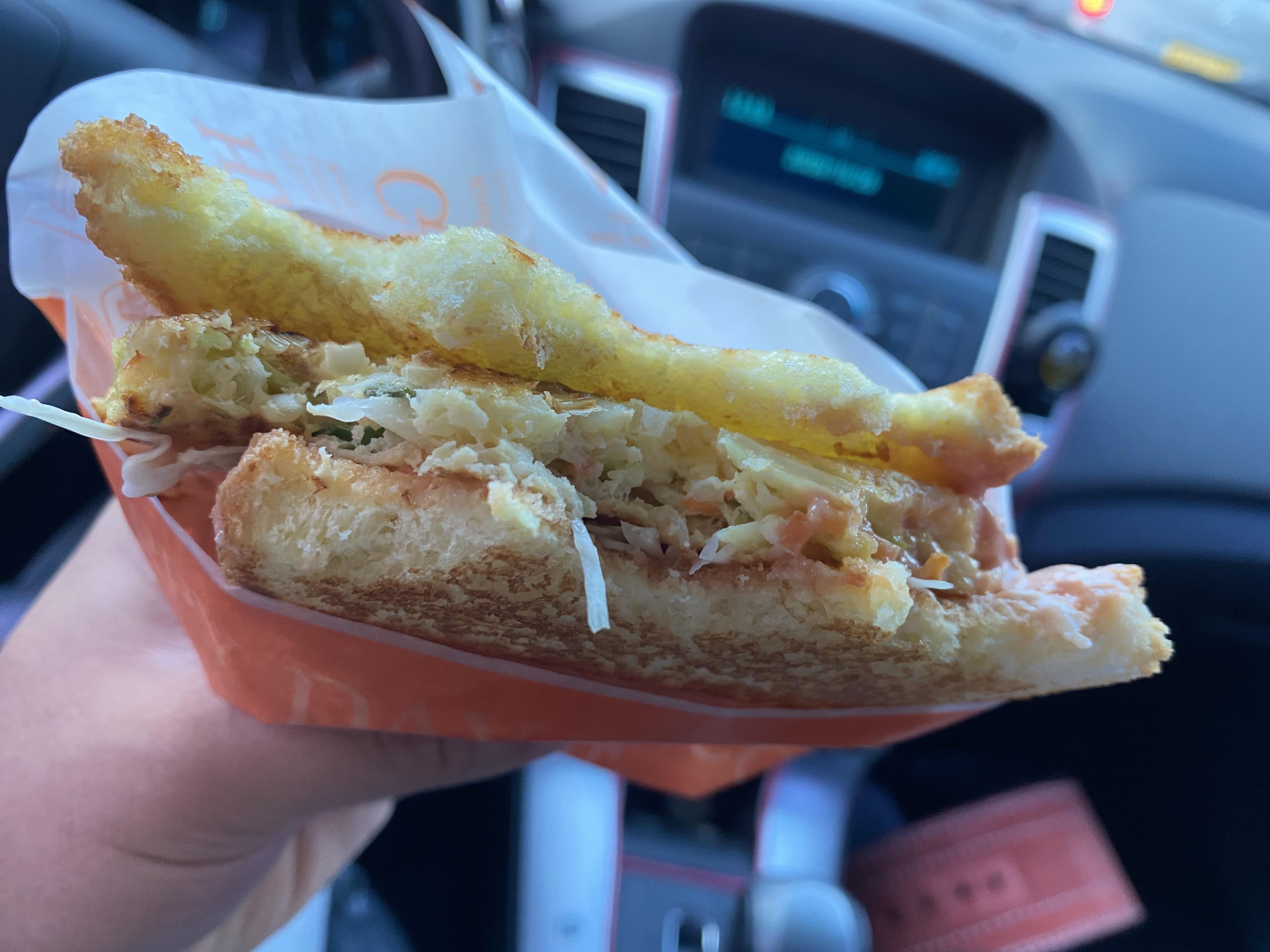 길거리 토스트 빵이 버터에 구워져서 바삭한데 안에는 두툼한 계란과 야채가 소스에 버무려져서 촉촉합니다. 설탕도 뿌려져서 토스트의 맛이 정말 맛있습니다.