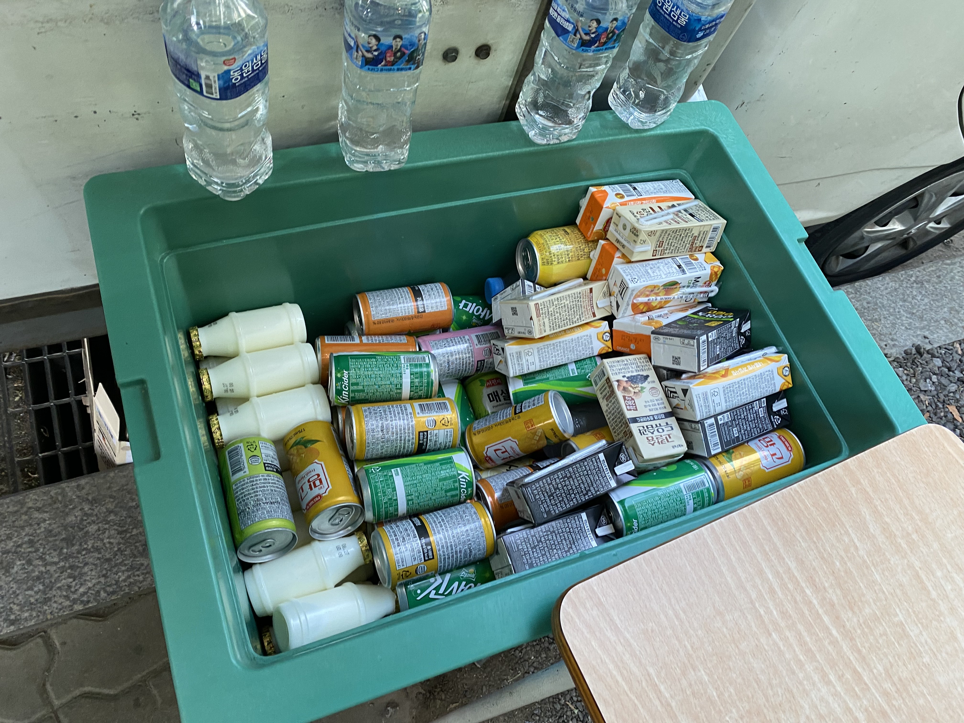 음료는 아이스박스에 담아져 있어서 취향에 따라서 고르시면 됩니다. 사이트, 망고, 주스, 두유, 물 등 다양하게 있고, 겨울에는 따뜻하게 데워져 있는 두유도 있습니다. 이런 거 보면 정말 사장님의 정이 느낄 수 있습니다.