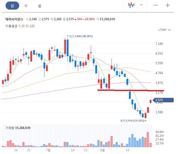 테라사이언스 일봉차트를 보시면 하향세를 보이면서 하락을 보이다가 다시 반등을 보여주고 있습니다. 하지만 저항대는 3,300원 부근이지만 환기종목이 해제된 게 아니기 때문에 주의해서 매매를 해야 할 거 같습니다.