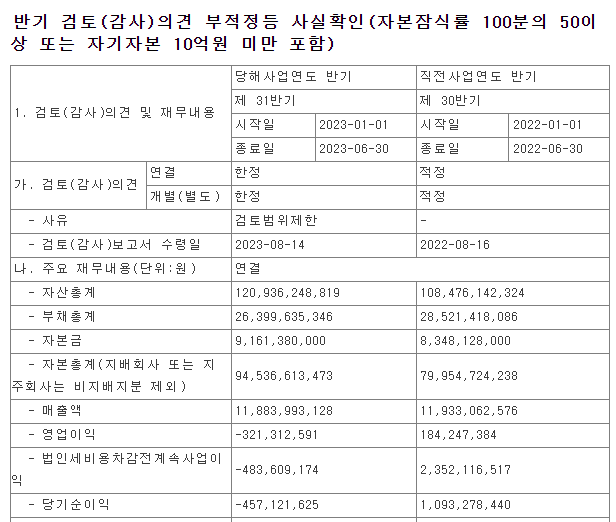 올해 상반기 누적 기준 연결 매출액은 약 118억으로 전년 동기 0.4% 감소했으며 영업이익은 -3억 2131만 원으로 적자전환했으며, 지배지분 순이익은 -3억 227만 원으로 적자가 되었습니다.