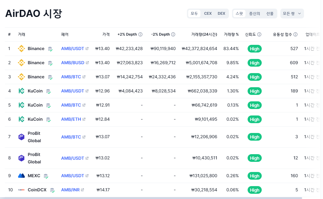 현재 바이낸스 거래순위를 보시면 AMBUSDT가 4위에 랭크가 되어 있습니다. 그만큼 관심을 많이 가지고 있는 에어다오 코인입니다.