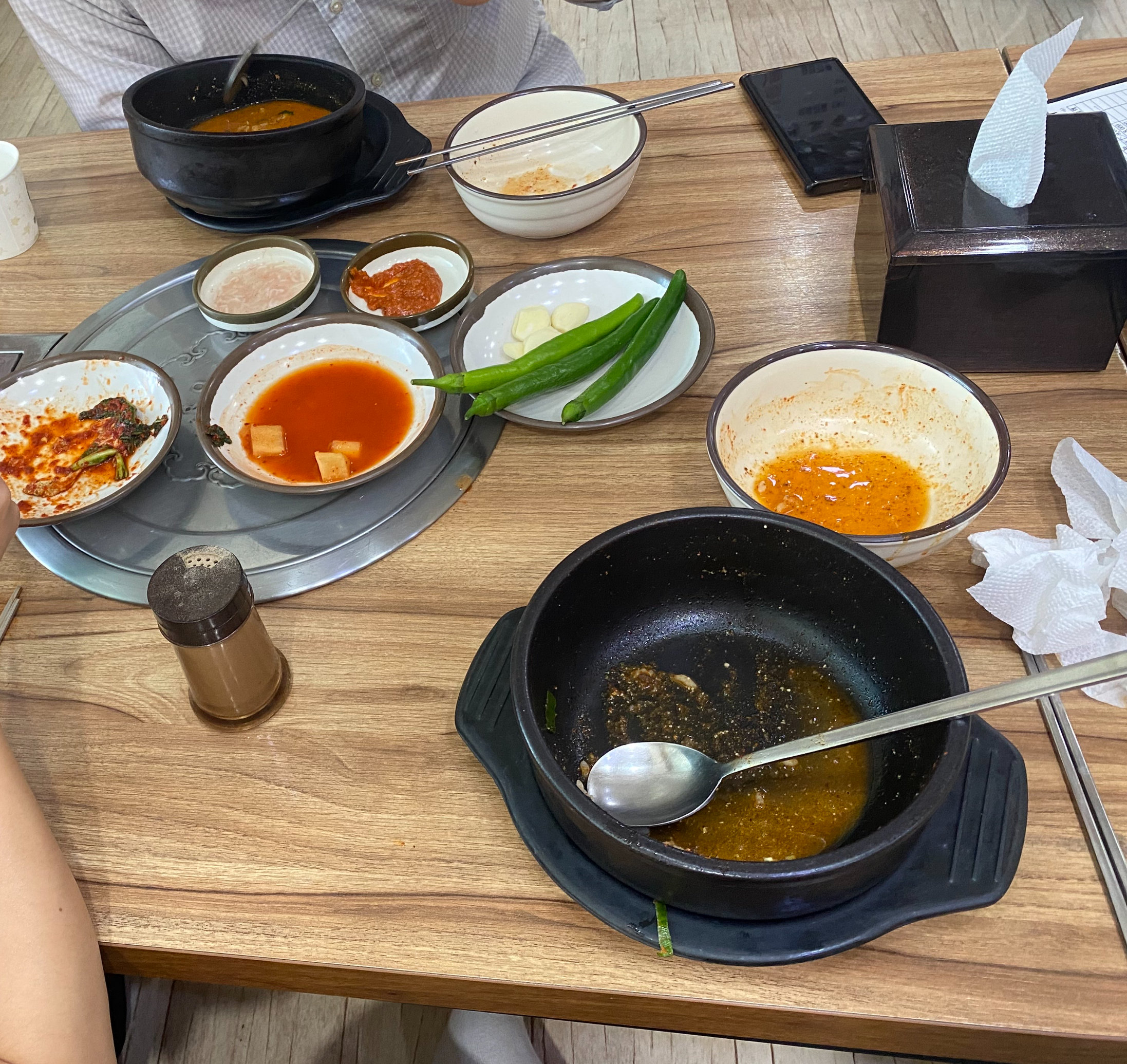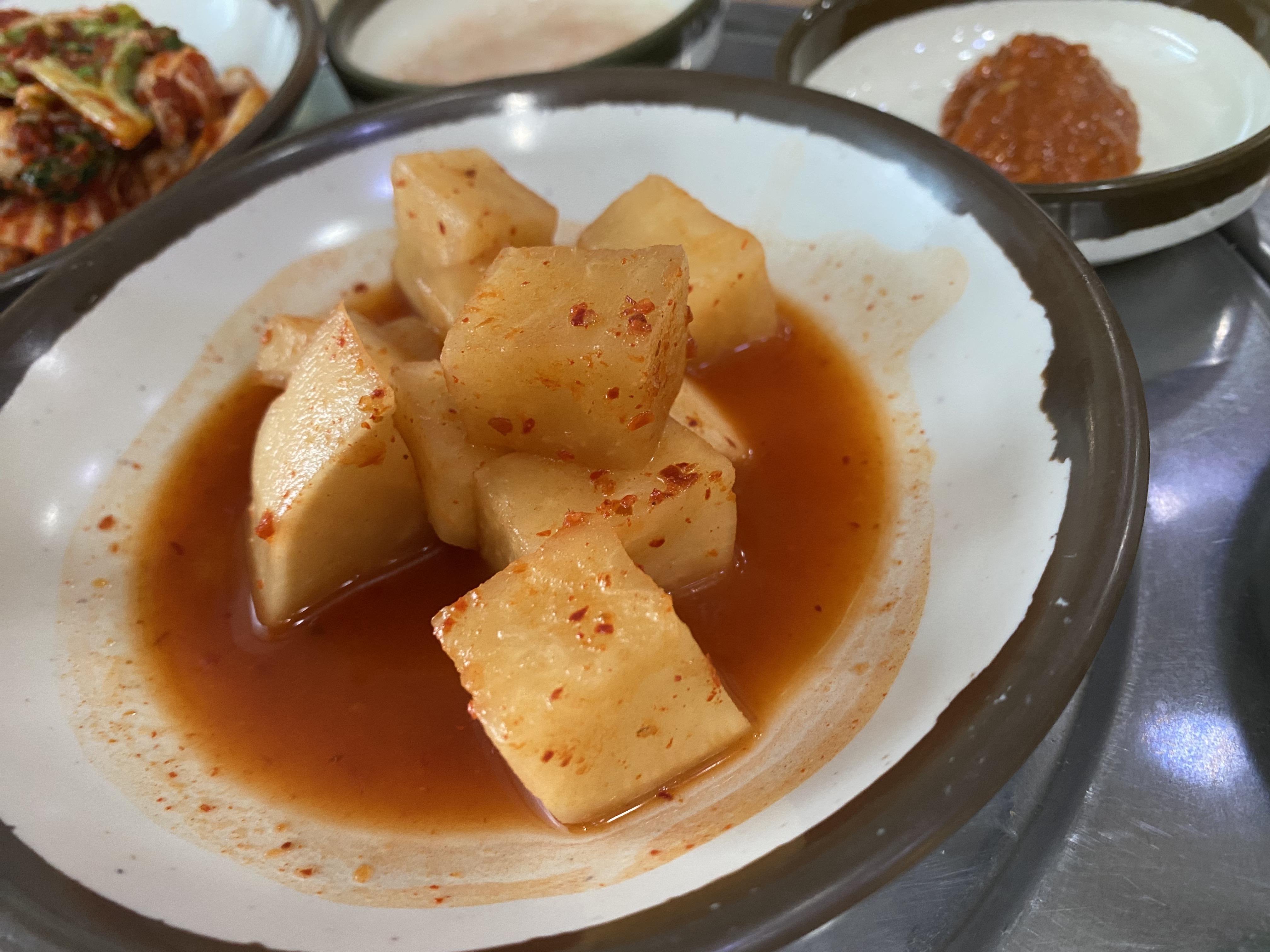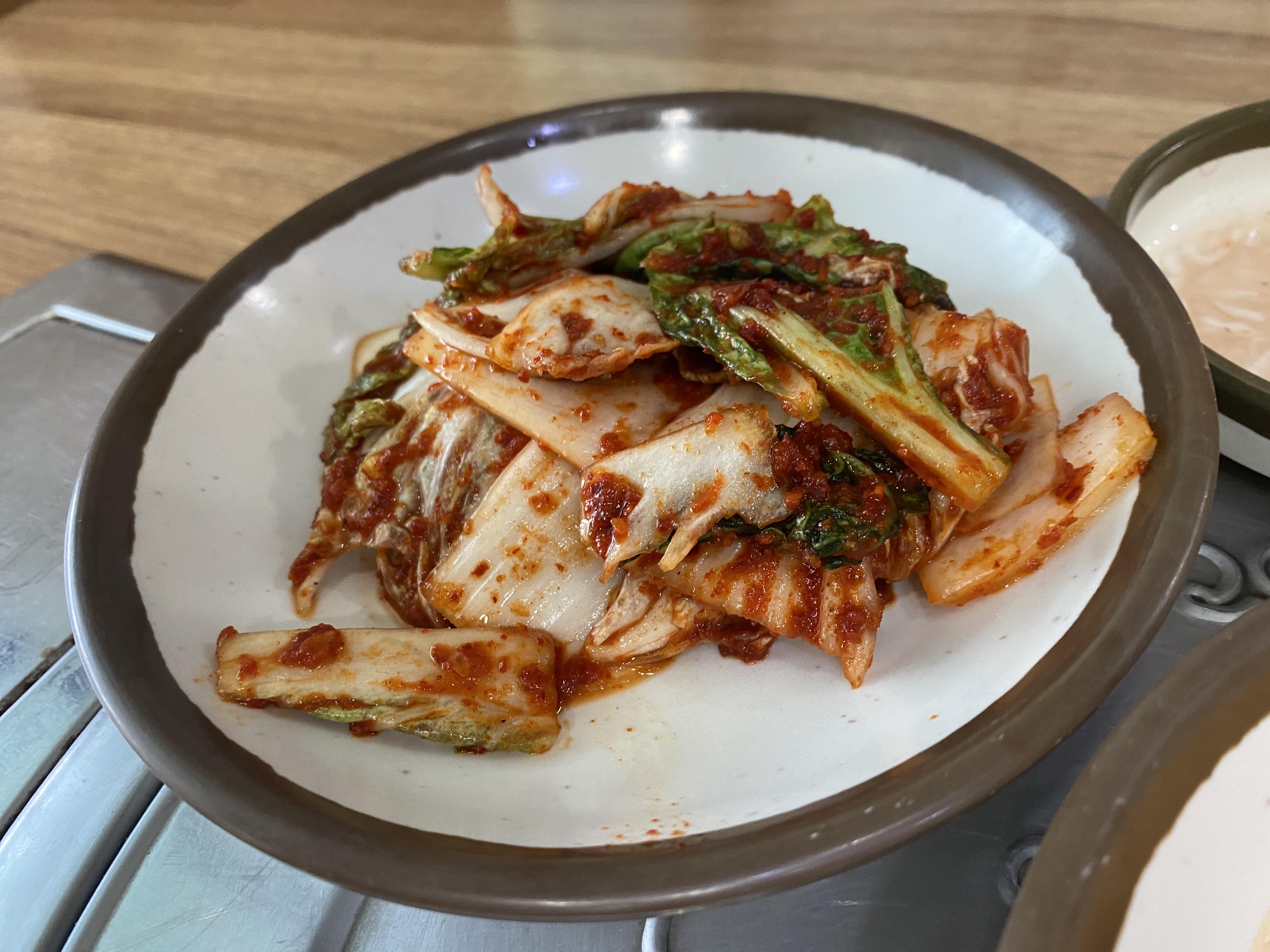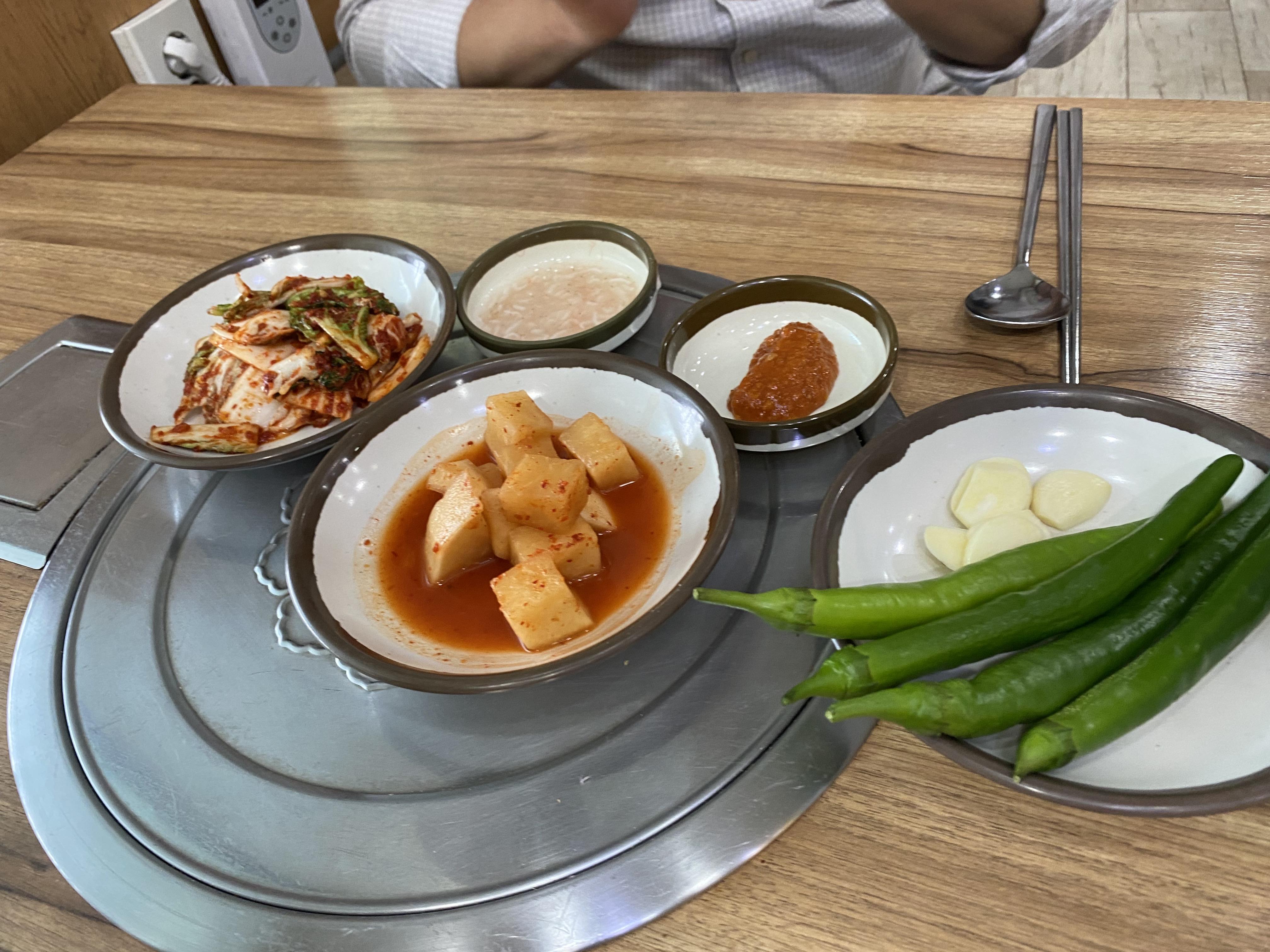 먼저 밑반찬은 깍두기, 김치, 고추, 마늘, 양파, 새우젓이 제공됩니다. 참고로 밑반찬은 셀프여서 추가로 드실 때는 직접 가져다 드셔야 합니다. 김치가 너무 맛있어서 3번이나 리필해서 먹었네요.