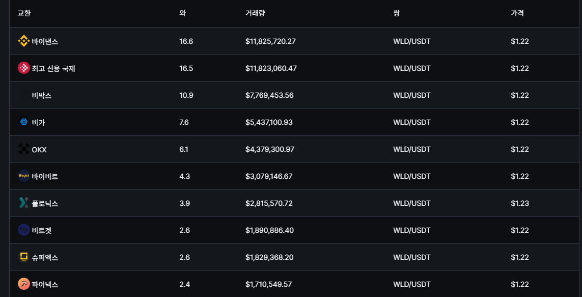 월드코인은 바이낸스, 비카, OKX, 바이비트, 비트켓 등에 상장되어 있으며, 국내 거래소는 빗썸과 코인원이 있습니다.