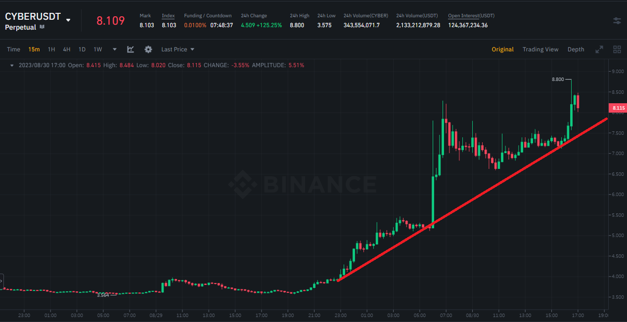 CYBER 코인은 8/29 새벽부터 상승을 하기 시작하면서 무서운 상승세를 보여주고 있습니다. 빨간 선 지지를 받으면서 지속적으로 상승을 하고 있으며 현재 120% 이상의 상승을 보여주고 있습니다. 선물거래를 하시면 최대 20배까지 가능한 코인이기에 엄청난 수익이 가능한 코인입니다.