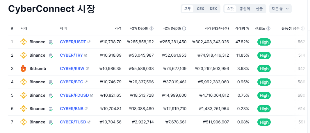 현재 사이버커넥트(CYBER)는 바이낸스에 상장을 했으며, 국내거래소는 업비트 BTC마켓, 빗썸, 코인원 등에 상장이 되어 있습니다.