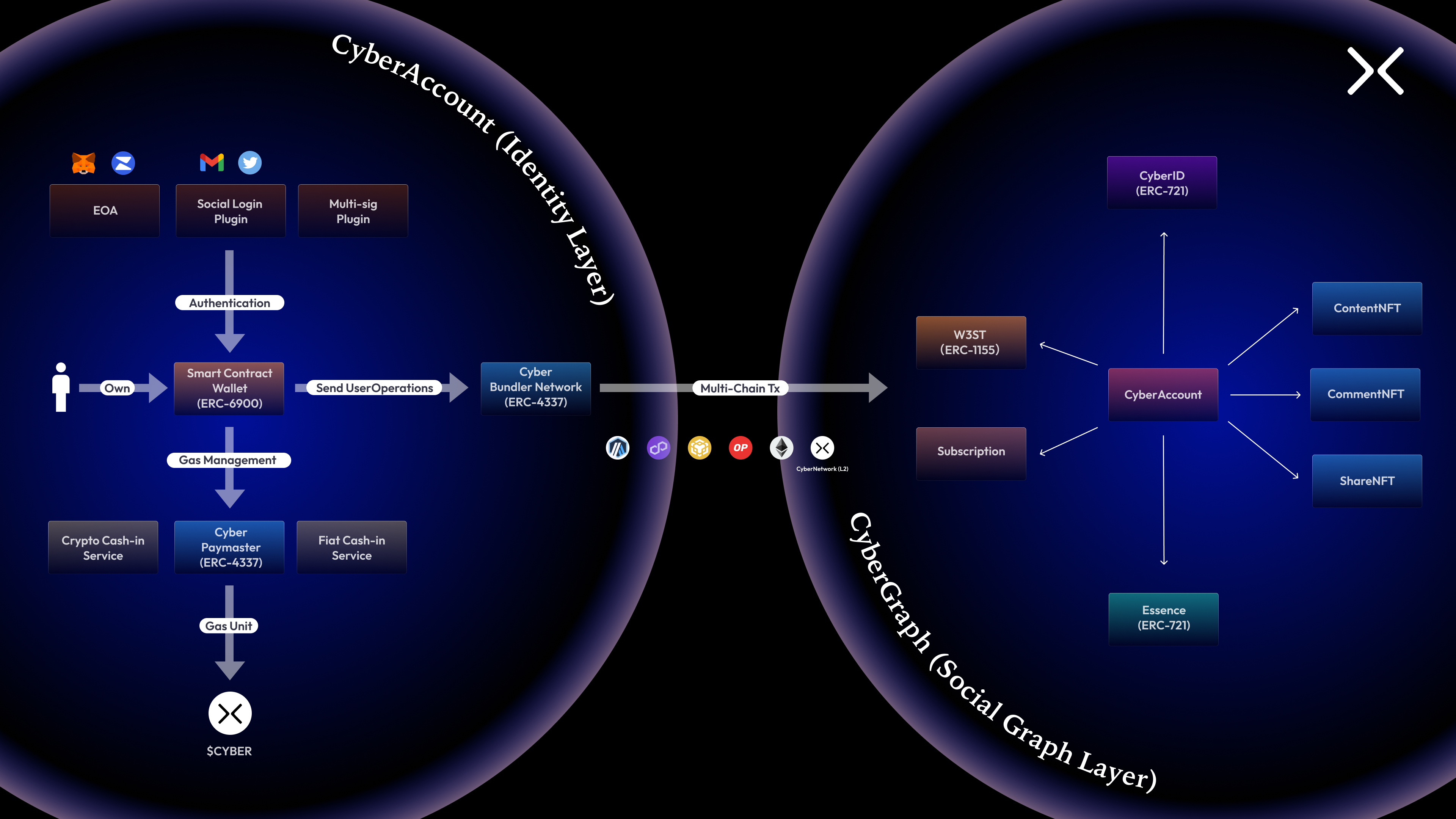 소개할 기능은 CyberAccount입니다. 이제 사용자들은 ERC-4337 계정 추상화를 활용하여 다중 체인 Web3 소셜 환경에 더 쉽게 참여할 수 있게 되었습니다. CYBER 토큰을 사용해 한 네트워크에서 모든 네트워크로 가스를 편리하게 지불할 수 있게 되었습니다. 또한 CyberGraph라는 기능을 소개합니다.