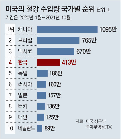 2021년 기준으로 한국은 미국에 철강을 수출하는 국가 중 4위에 해당하는 규모이므로
