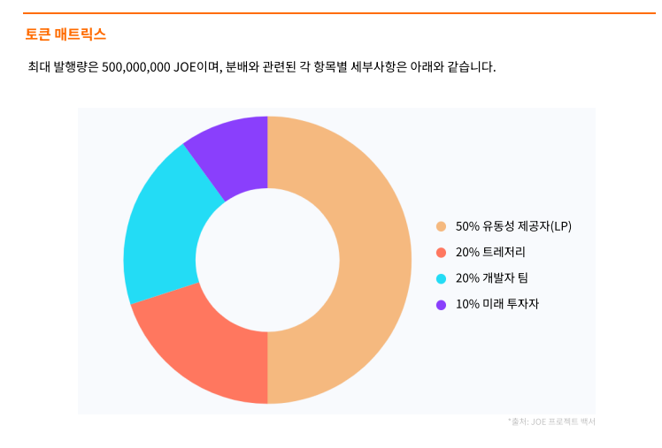 최대 발행량은 500,000,000 JOE 이며, 50%는 유동성 제공자(LP), 20%는 트레저리, 20%는 개발자 팀, 10%는 미래투자자로 분배되어 있습니다.
