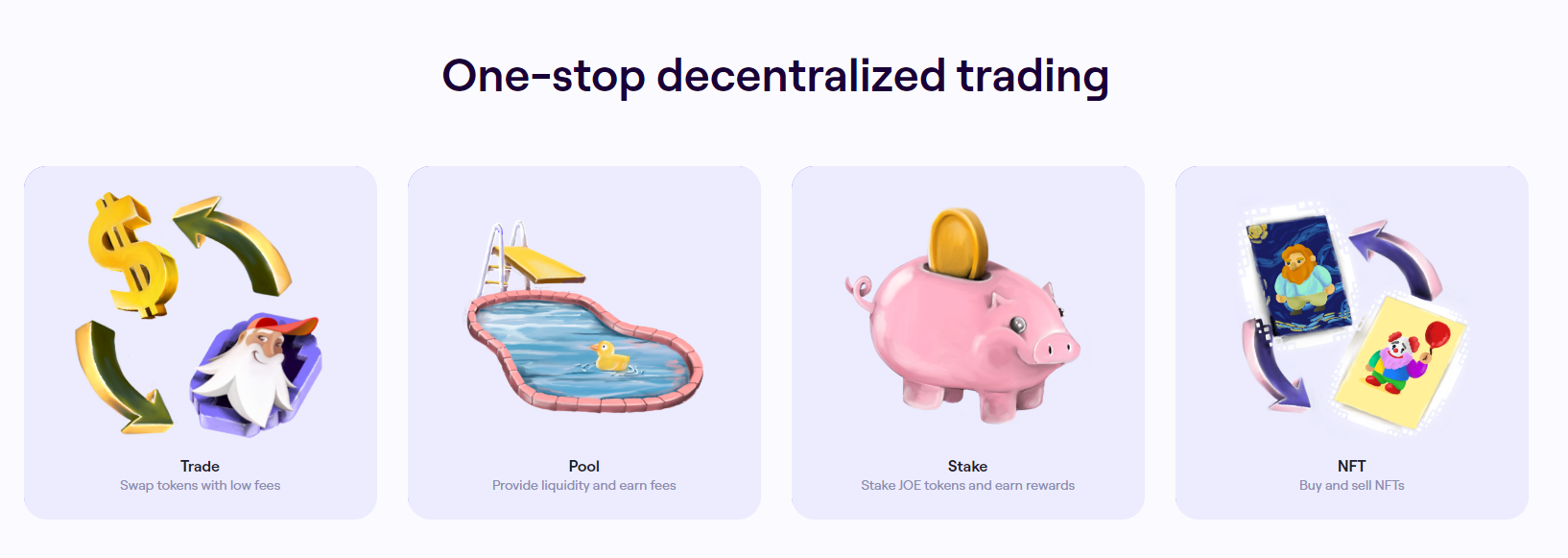 트레이더 조(JOE)는 아발란체의 메인 디파이 플랫폼입니다. DEX와 DeFi 대출을 결합하여 레버리지 거래를 제공하는 프로젝트로서, V2의 새로운 AMM인 Liquidty Book을 도입하여 슬리피지 절감, 비영구적 손실 감소 등을 이루는 것이 목표입니다. 2023년 8월에는 아발란체 및 아비트럼 DEX 중 TVL 상위권을 차지하고 있습니다.