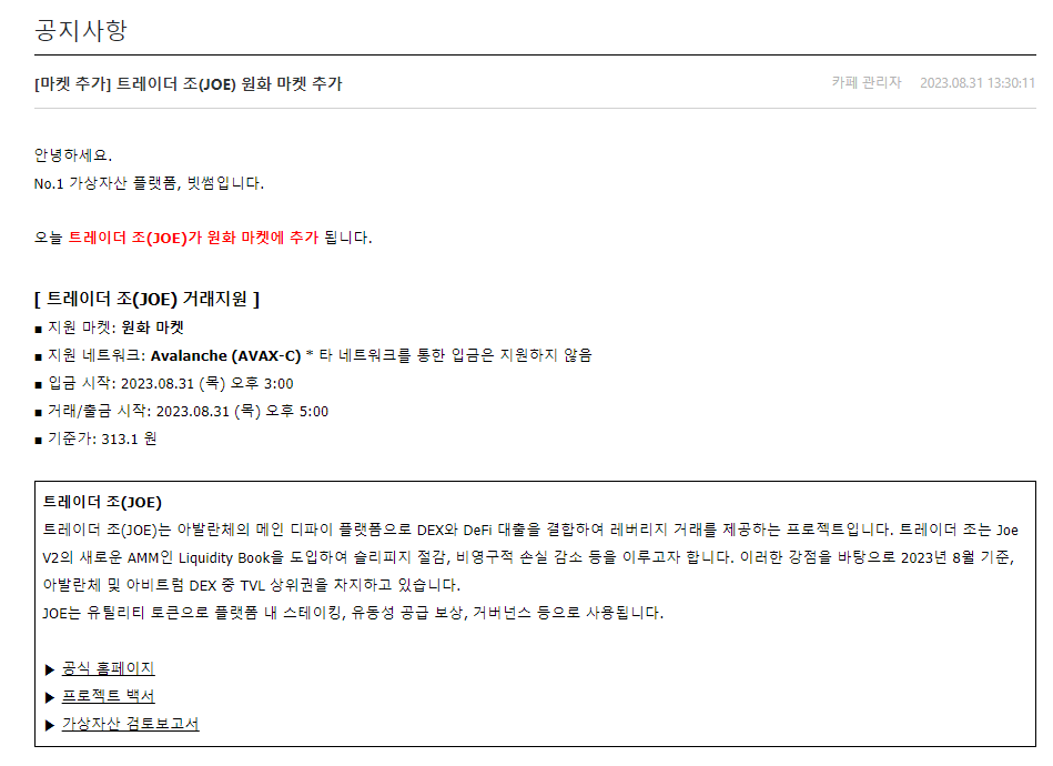 트레이더 조는 빗썸 원화마켓에 2023년 8월31일 목요일 오후 5시에 거래가 시작하면서 상장의 신호탄을 알렸습니다.