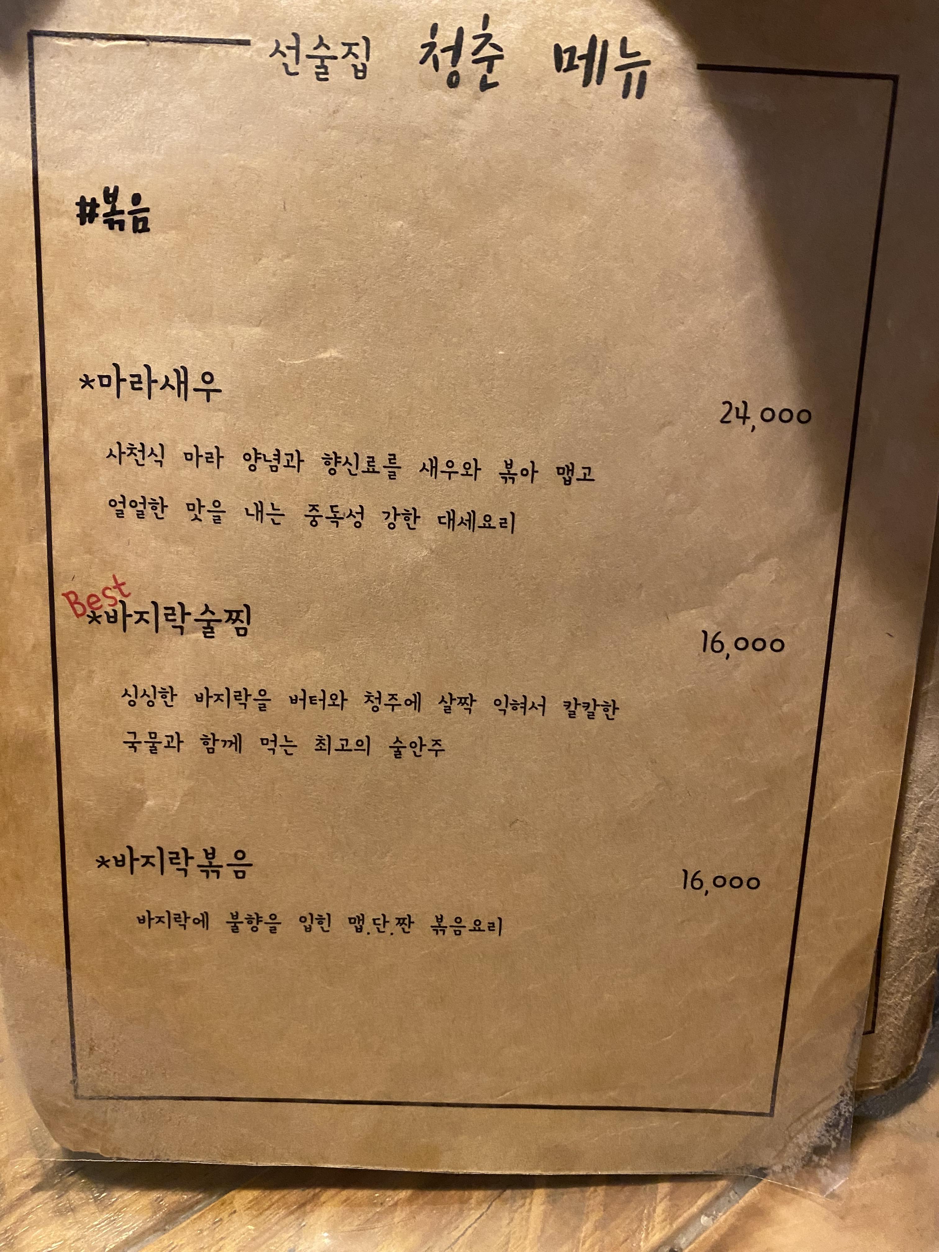선술집 청춘은 일품, 볶음, 구이, 탕류, 튀김류, 마른안주 총 8 페이지의 메뉴가 있습니다. 베스트 메뉴는 바지락 술찜, 스키야키, 오뎅나베, 고등어된장구이, 치킨 가라아게가 있는데 저희는 이중에서 바지락 술찜과 치킨 가라야게를 주문했습니다.