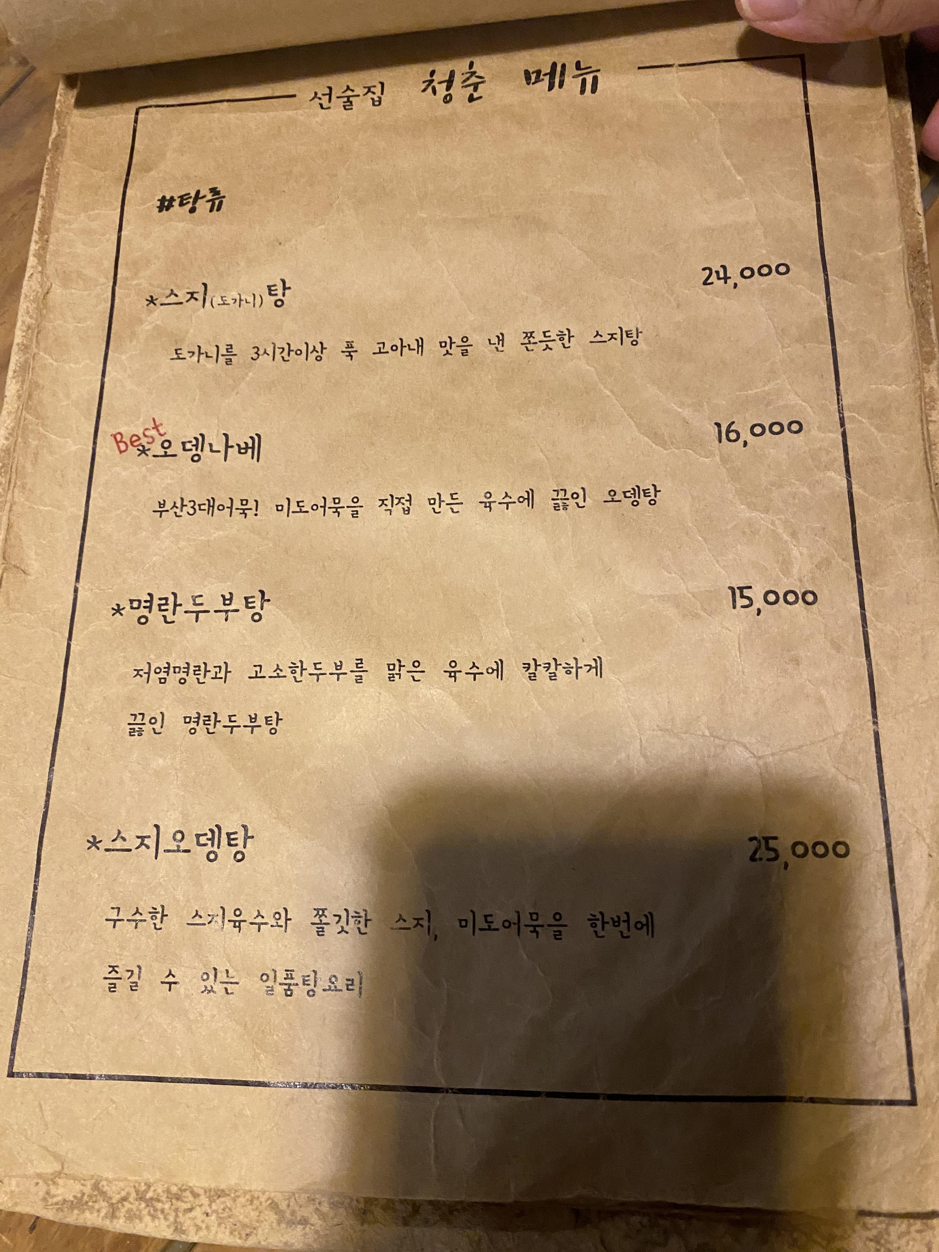 선술집 청춘은 일품, 볶음, 구이, 탕류, 튀김류, 마른안주 총 8 페이지의 메뉴가 있습니다. 베스트 메뉴는 바지락 술찜, 스키야키, 오뎅나베, 고등어된장구이, 치킨 가라아게가 있는데 저희는 이중에서 바지락 술찜과 치킨 가라야게를 주문했습니다.
