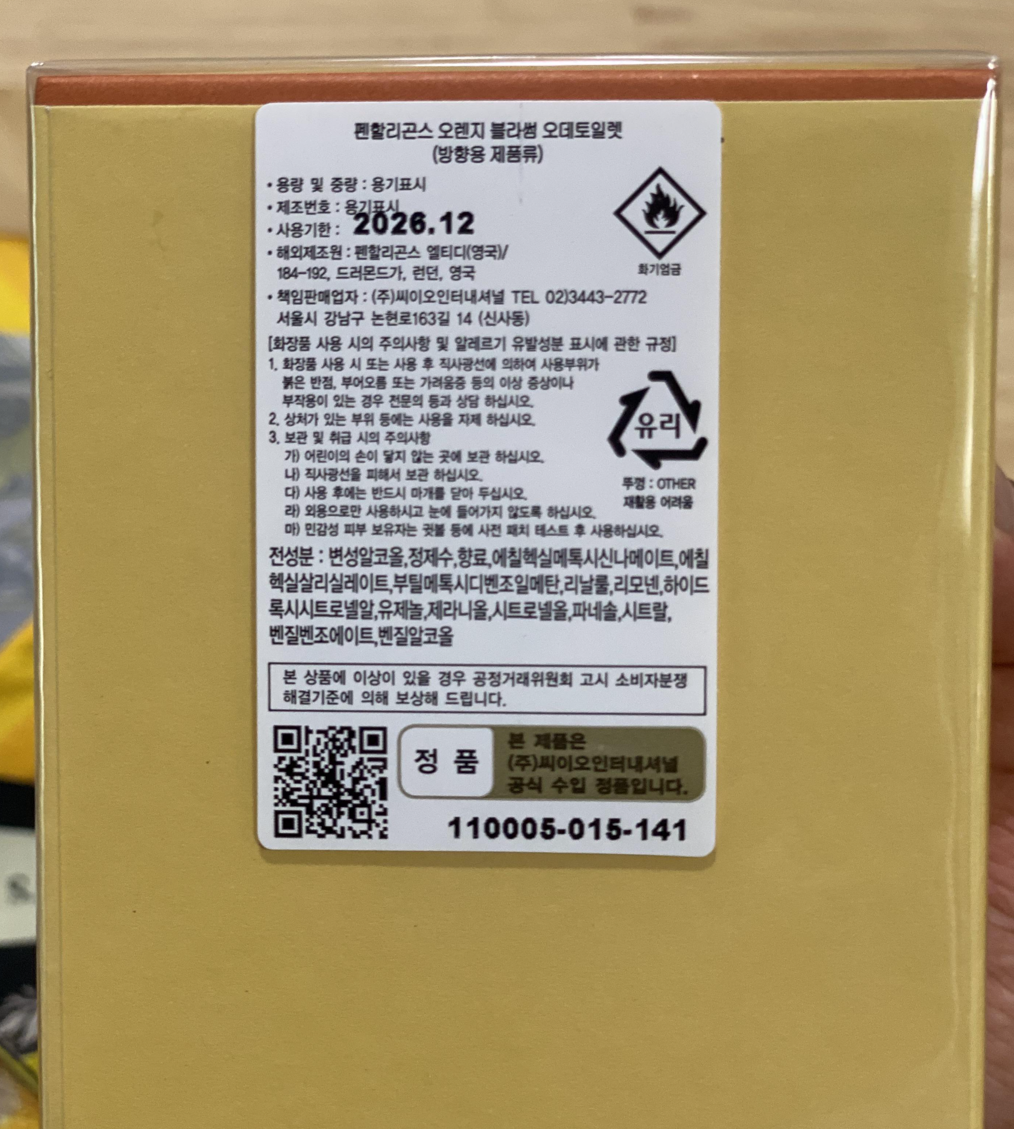 펜할리곤스 향수의 가격대는 100ml 기준으로 20~30만 원 정도 가격대가 나갑니다. 아무래도 나이가 있을수록 고가의 향수를 찾게 되는데 그중 적당하다고 생각한 게 펜할리곤스 오렌지 블라썸입니다.