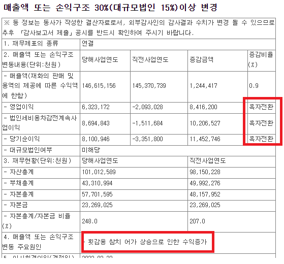 횟감용 참치 어가 상승으로 인한 수익 증가로 재무제표가 개선되면서