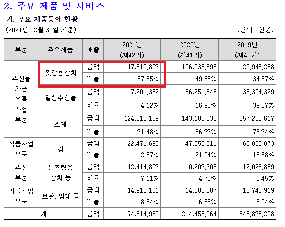 수산가공품이 44% 정도 발생하고 있는 기업입니다.