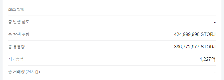 총 발행수량은 424,999,998이며, 총 유통량은 386,772,977 STORJ입니다. 현재 약 91% 유통이 되고 있으며, 시가총액은 1,227억 정도입니다.
