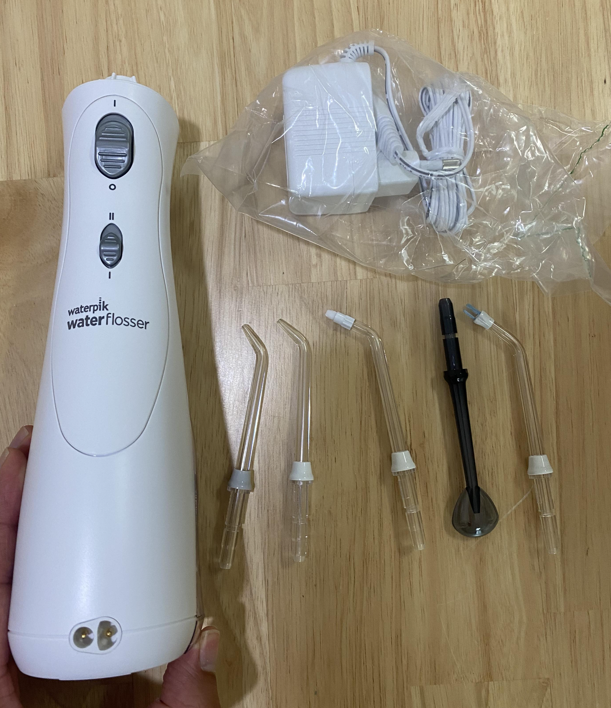 구성품은 워터픽 본체와 충전 어답터와 팁이 있습니다. 팁은 기본 제트 팁 2개, 플라그 팁 1개, 치열교정 팁 1개, 혀 클리너 팁 1개로 총 5개가 있습니다.