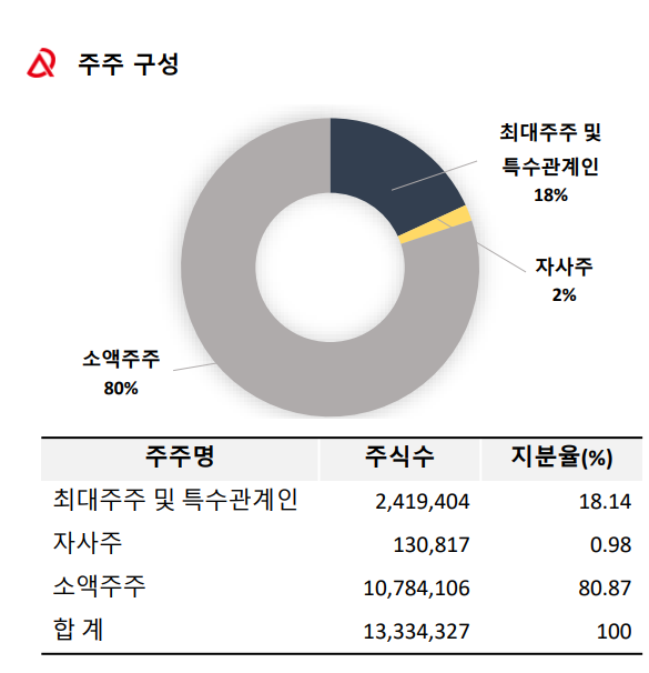 에이디테크놀로지 주주구성을 보면 김준석 대표외 특수관계인이 18.14%, 자사주가 0.98%, 소액주주가 80.87% 지분을 가지고 있습니다. 소액주주 지분율이 훨씬 많은 것을 알 수 있습니다.