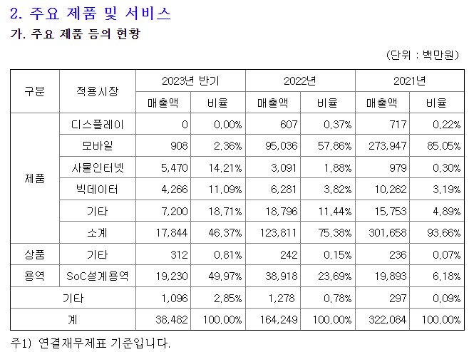 주요 제품 및 서비스를 보면 디스플레이, 모바일, 사물인터넷, 빅데이터, 기타, SoC 설계용역으로 나뉘어 매출이 발생하고 있습니다.