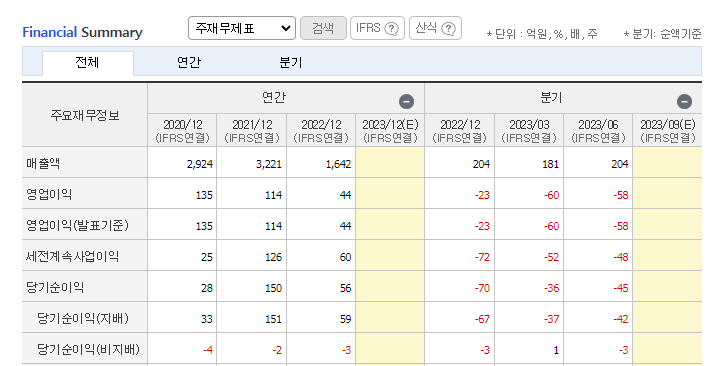 재무제표를 보시면 전기 대비 주요 매출처 매출액 감소로 인하여 -49% 감소하였습니다. 영업이익 또한 반도체 시황 악화에 따라서 61% 정도 감소하였습니다.