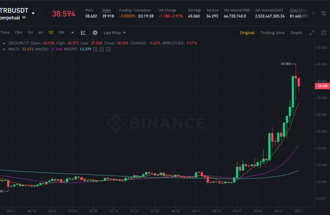 인베스팅 닷컴에 따르면 큰손 투자자가 대량 거래로 TRB 코인의 가격급등을 이뤄냈으며, 코인을 거래소에 재예치하는 방식으로 수익을 창출한 것으로 알려져 있습니다. TRB 가격이 2주 만에 18달러에서 38달러 이상으로 두 배가량 상승한 것으로 보아 110만 달러의 차익을 챙긴 것으로 보인다고 합니다.