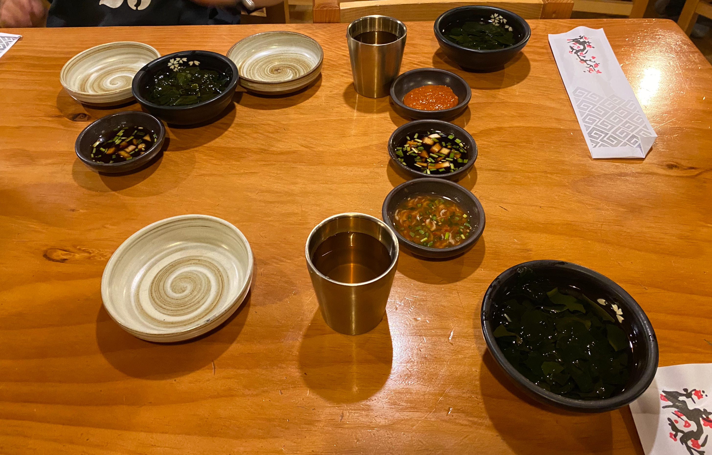 기본반찬은 냉미역구과 각종 소스류가 제공됩니다. 동동주를 주문했는 살얼음으로 되어 있어서 엄청 맛있어 보입니다.