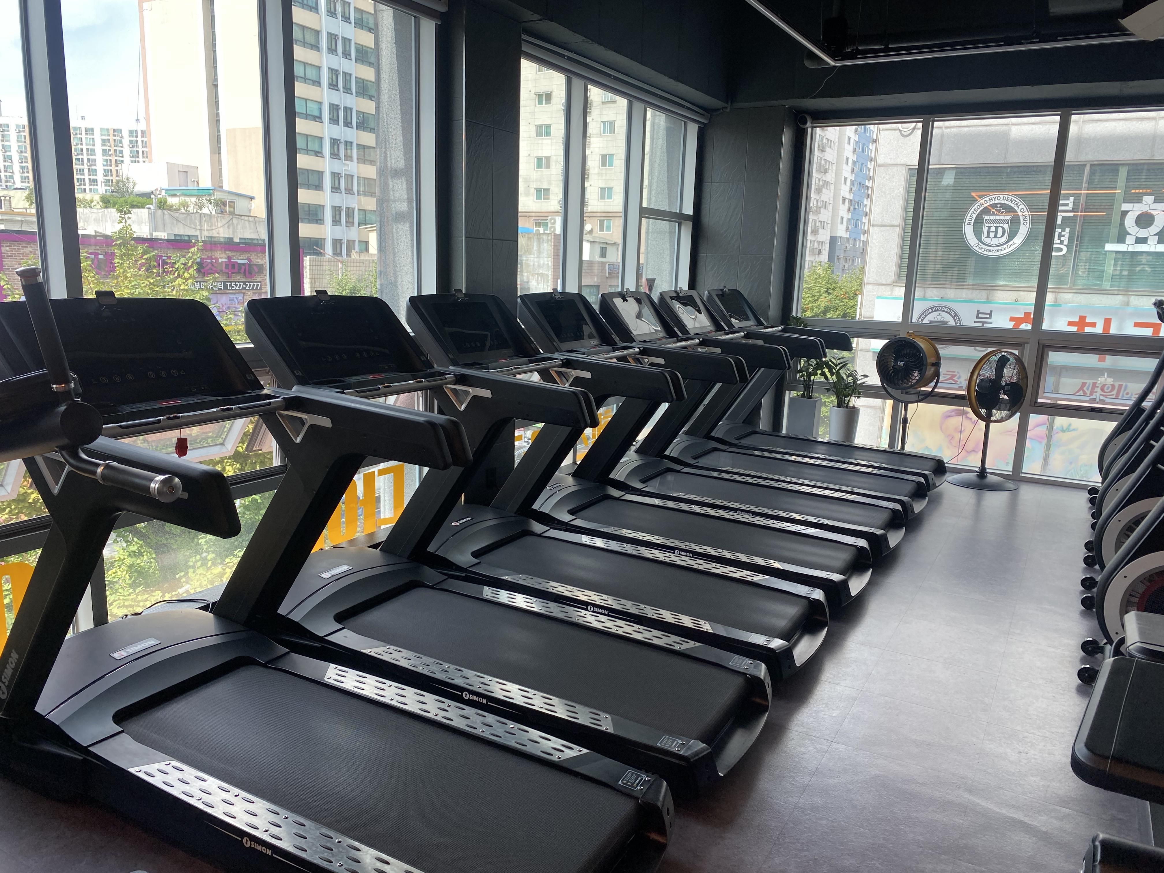 최고급 러닝머신과 천국의 계단이 여러 개를 보유하고 있어서 시장뷰를 보면서 유산소운동을 할 수 있습니다. 중간에 대형 선풍기가 여러개 설치되어 있어서 쾌적한 환경에서 운동을 할 수 있습니다.