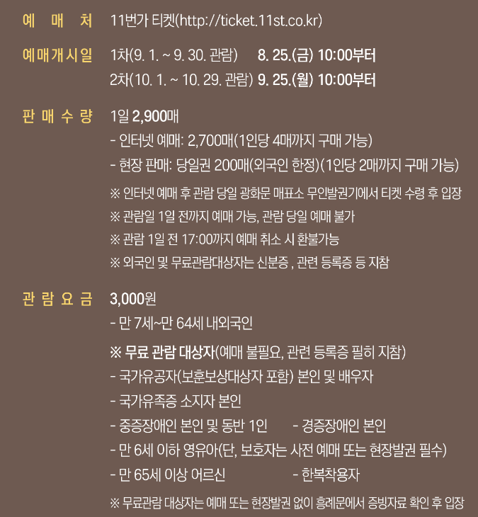 한복이 입기 부담스러우신분은 티켓을 예매하고 관람을 하시면 됩니다. 참고로 한복을 입고 찾아오시는 분들이 정말 많아서 자연스럽게 입장할 수 있습니다.